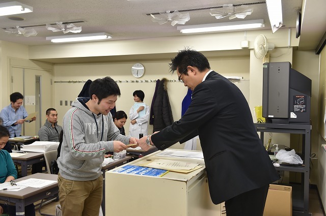 卒業直前。卒業関係の証明を受け取る西尾君。学科長は光畑先生だったんだねー。