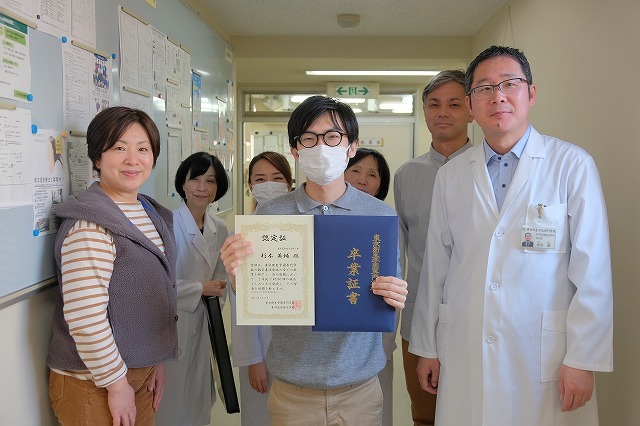 仕事の都合で卒業式に参加できなかったエイちゃんが、卒業証書を取りに来ましたのでみなで撮影。