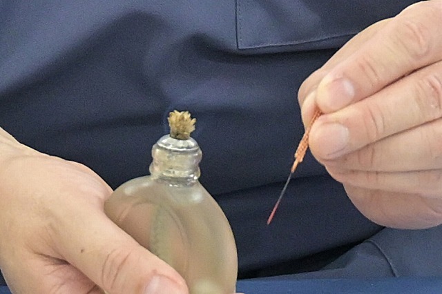 写真:アルコールランプで鍼を炙ったところ。鍼尖が赤くなっているのが分かります。この状態で人体に刺します。