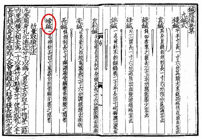写真:杜思敬(1234~1316)によって書かれた『鍼経摘英集』は鍼のイラストが初めて描かれた鍼灸古典です。赤丸の部分を拡大すると↓
