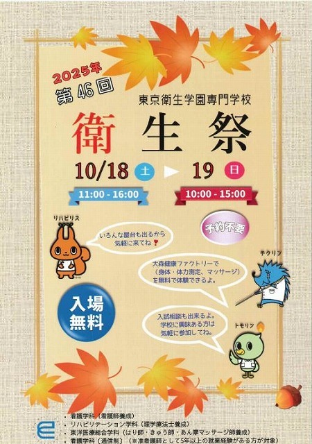 はい、ってことで第46回衛生祭(東京衛生学園専門学校学園祭)が10月17日(土)、18日(日)開催です。