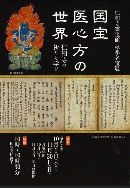 仁和寺には、古くから医学の研究と実践を行ってきた附属の寺院(院家)である心蓮院(しんれんいん)がありました。心蓮院は、代々、官医や医者から医学書を寄進してもらったり、寺院内で積極的に写本を作成したりして、体系的に医学書を収集していました。この心蓮院が集めていた医学書群の中に、『医心方』の写本も含まれており、現在、国宝として伝わる「仁和寺本」はその一部であるとされています。そして、現在、仁和寺が代々受け継いできた貴重な寺宝を管理・公開するための施設として昭和2年(1927年)に建築された「霊宝館」にて展示されている、ということです。