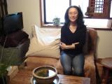 写真:尾名高典子先生(メダカも一緒に写ってます)、治療ブース
