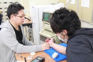 3年間で理学療法士を目指す、リハビリテーション学科の2年生が生理学実習に取り組みました。生理学実習では、「感覚」、「筋力」、「呼吸・代謝」、「神経・筋」「循環」の5つの分野について、クラスメイトや動物をモデルにデータ測定や実験を行います。