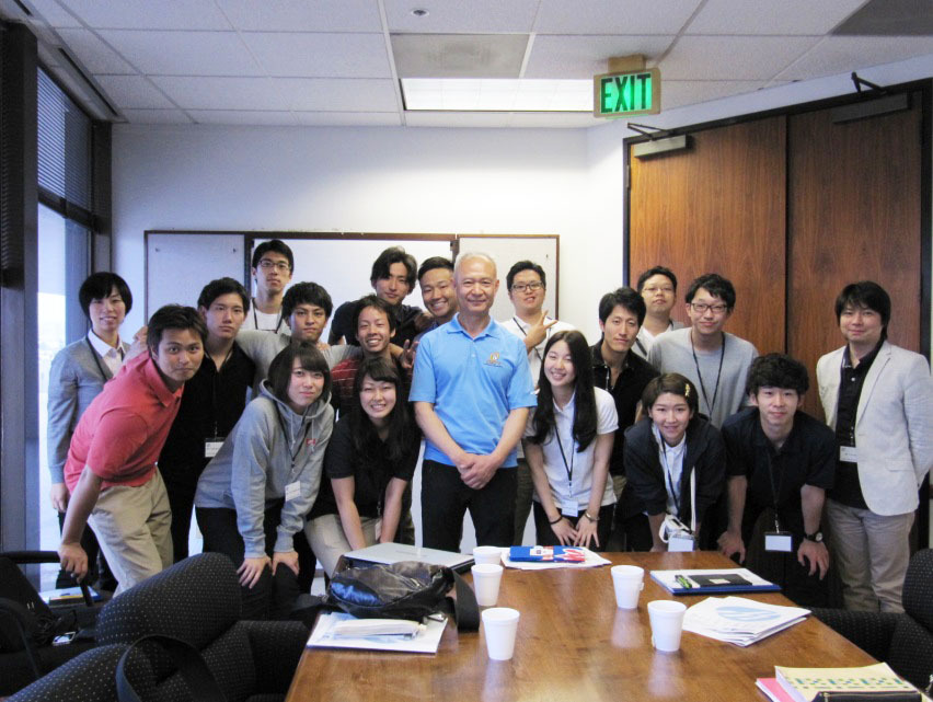 ロサンゼルス到着後、長旅の疲れを見せず、学生のテンションはMAXに!いよいよアメリカでの研修が始まります(右端は井上裕次先生)。